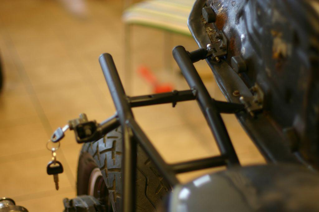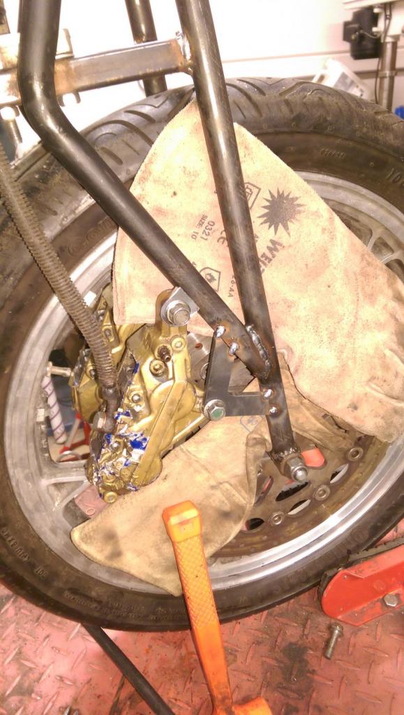 I hestitated because my cagiva is a very comfy bike for everyday use. Then something nice happened. The donor bike, a suzuki GS1000, was allmost given to me so nothing held me back to cut it in half. At first, the rear end was changed with a monoshock suspension on a braced swing arm. Funny detail: the passenger footrest brackets are now an integral part of the swingarm! At the front it is now a monoshock too. While building, the design changed a bit but still it is the STL system. The datalogger is installed and the first logs are made.